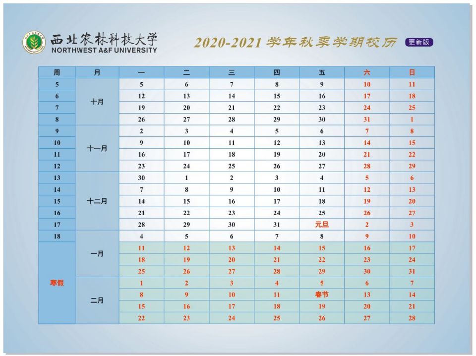 从10月1日(星期四)起执行冬季作息时间;10月5日(星期一)起,执行2020-2021学年秋季学期校历(更新版)。