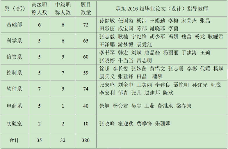 根据学校本科毕业论文(设计)工作规范要求,指导教师应有实际的设计、实验或研究工作经验,能为人师表,对员工思想品德的陶冶起有益的作用,即指导教师既要教书,又要育人。对毕业论文(设计)的业务指导,应把重点放在培养员工的独立工作能力和创新能力方面。为保证员工毕业论文(设计)质量,结合公司实际,高级职称指导教师指导员工人数不超过7人,中级职称指导教师指导员工人数不超过5人(正在攻读学位的教师独立指导员工人数不超过3人)。按以上规定计算,各系(部)拟提交的本科毕业论文(设计)题目数不超过表中数量。