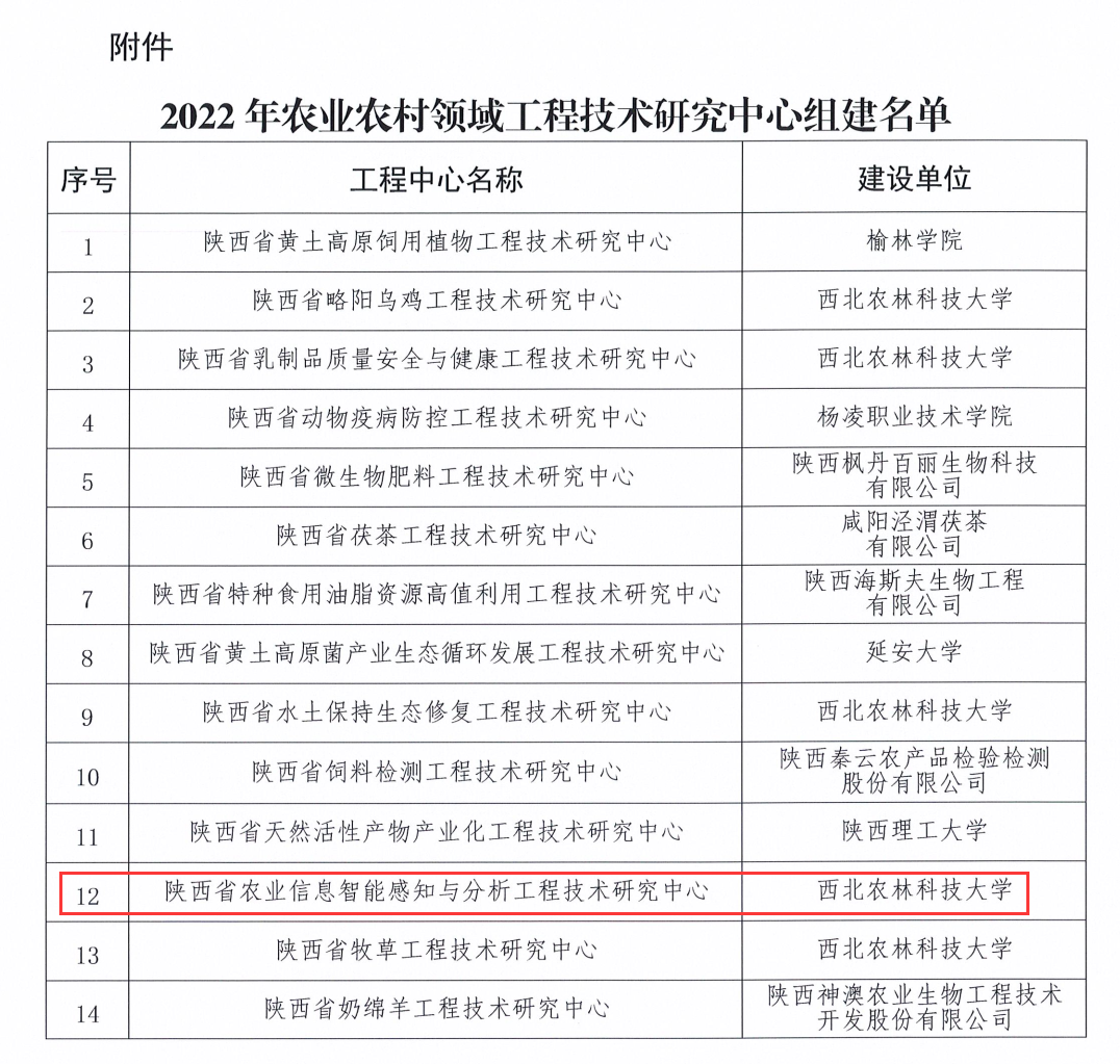 11月30日,陕西省科技厅公布了2022年农业农村领域工程技术研究中心组建名单,公司申报的“陕西省农业信息智能感知与分析工程技术研究中心”位列其中,这是公司获批的首个工程技术研究中心,标志着学院开启了更有依托、更有组织、更有导向科研的新篇章。