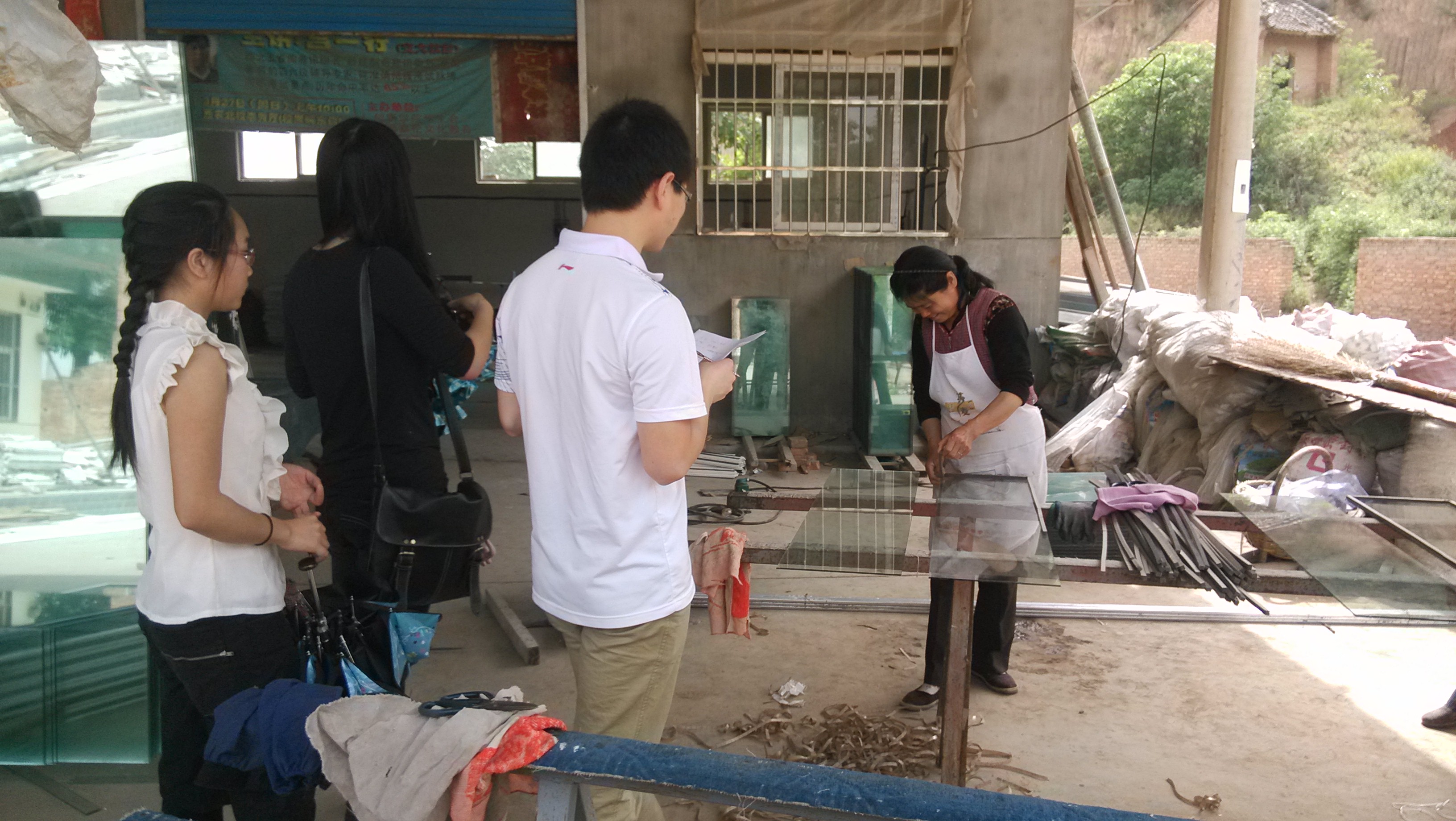 队伍抵达目的地后,大家不顾路途劳累,一下车便走向村委会,在与村长进行了简短的交流后,田园使者们在村长的带领下,去拜访了一些当地的村民,他们了解到,马家底村共有人口200余人,人均8分地,村里开设一家玻璃门窗加工厂,共有十几个人工作,人均工资40元/天。村里共有小员工10人,初中生3人,高中生3人,老员工6人,教育条件很艰苦,没有学校,孩子们都需要到邻村上学。虽然烈日当头,但田园使者们热情不减,在了解完一些基本情况后,又前往乡间地头,帮助农民拔草,体验了农民的田间生活。