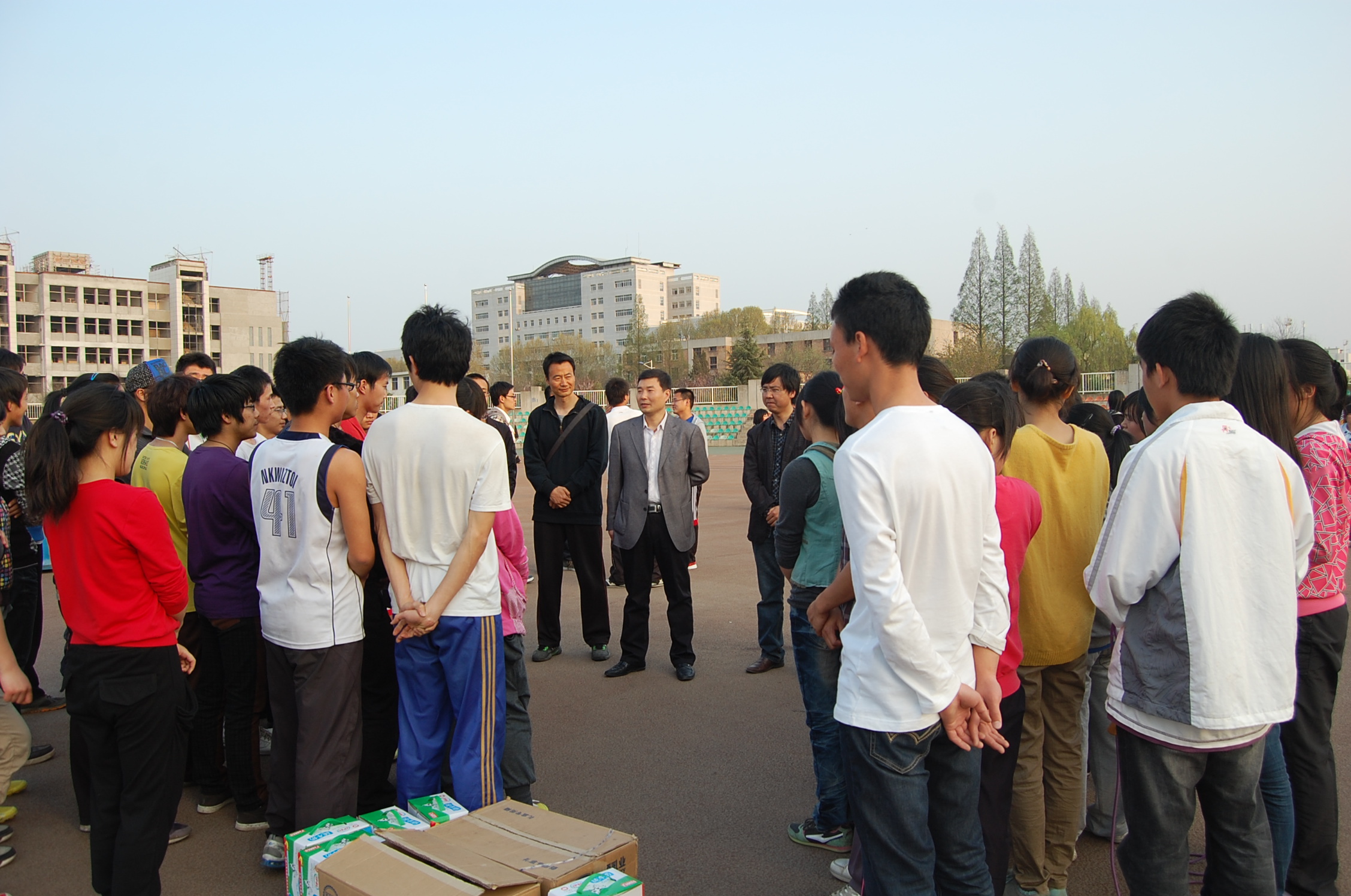 4月9日下午6:00,公司党委副书记何卫军携带营养品赴田径场慰问了积极备战校运会的运动员们。学院辅导员谷申杰老师和倪玲老师陪同参加了此次活动。