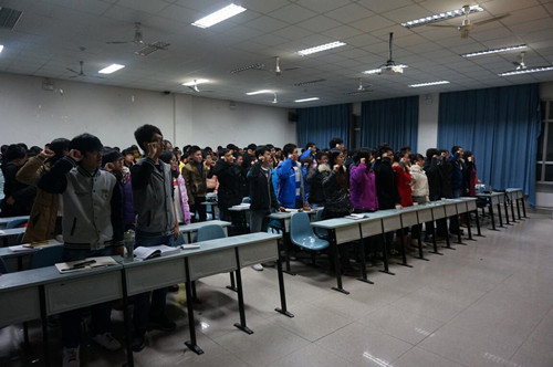 首先举行了团课开课典礼,在同学们庄重、严肃地唱完团歌后,12级辅导员朱旭菲宣读了团课章程。接下来,团工委副书记王珏宣读了团课注意事项。然后,员工代表苏庆国发表了讲话。最后,团课仪式在同学们慷慨激昂地宣誓声中结束。