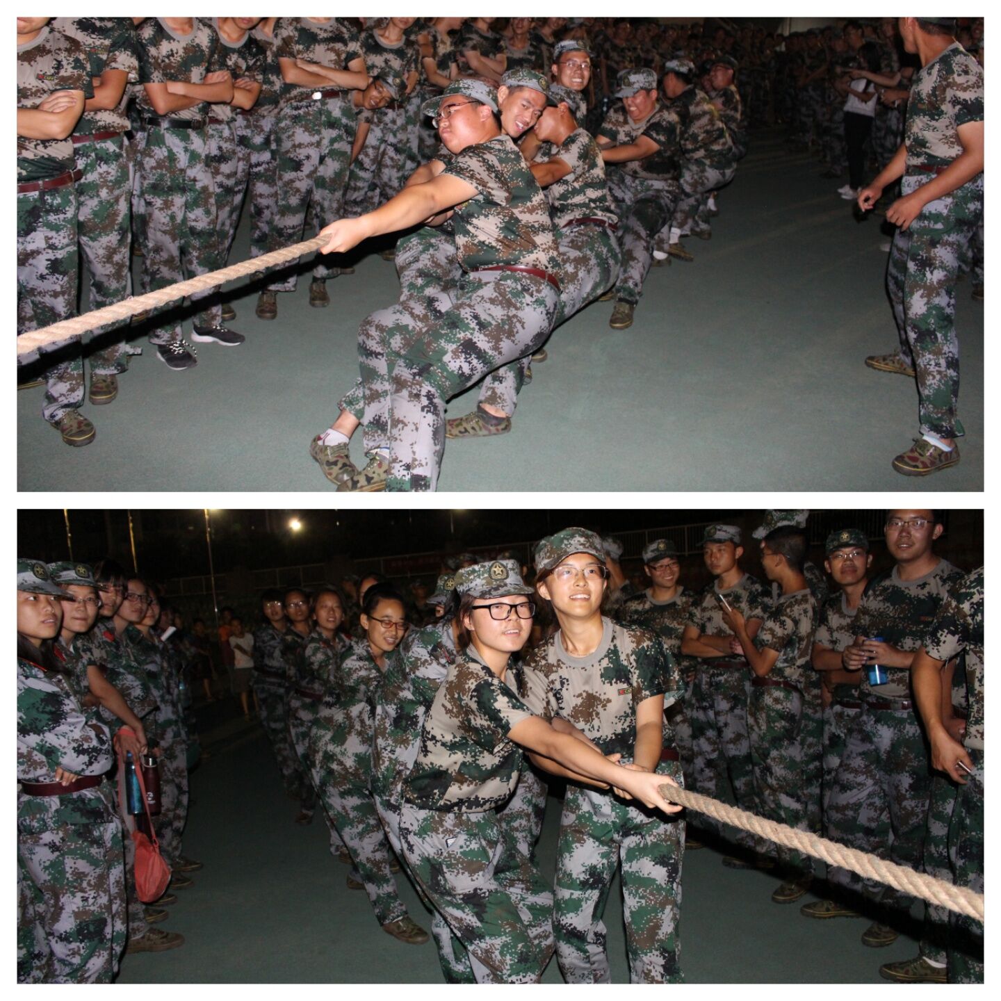 女生的比赛也令人揪心不已。第二场比赛时,由于一方队员发力不当,导致本队成员全部摔倒。尽管局势百般不利,她们依然抓紧绳子,咬紧牙关卷土重来。她们不仅给予我们团结的启示,更告诉我们什么叫坚持,什么叫永不言弃。这是一场无关胜负的友谊赛,但从她们身上我们看到了中国女排那样的顽强精神,相信在今后的学习生活中,她们必能笑对每一件经手的事情。