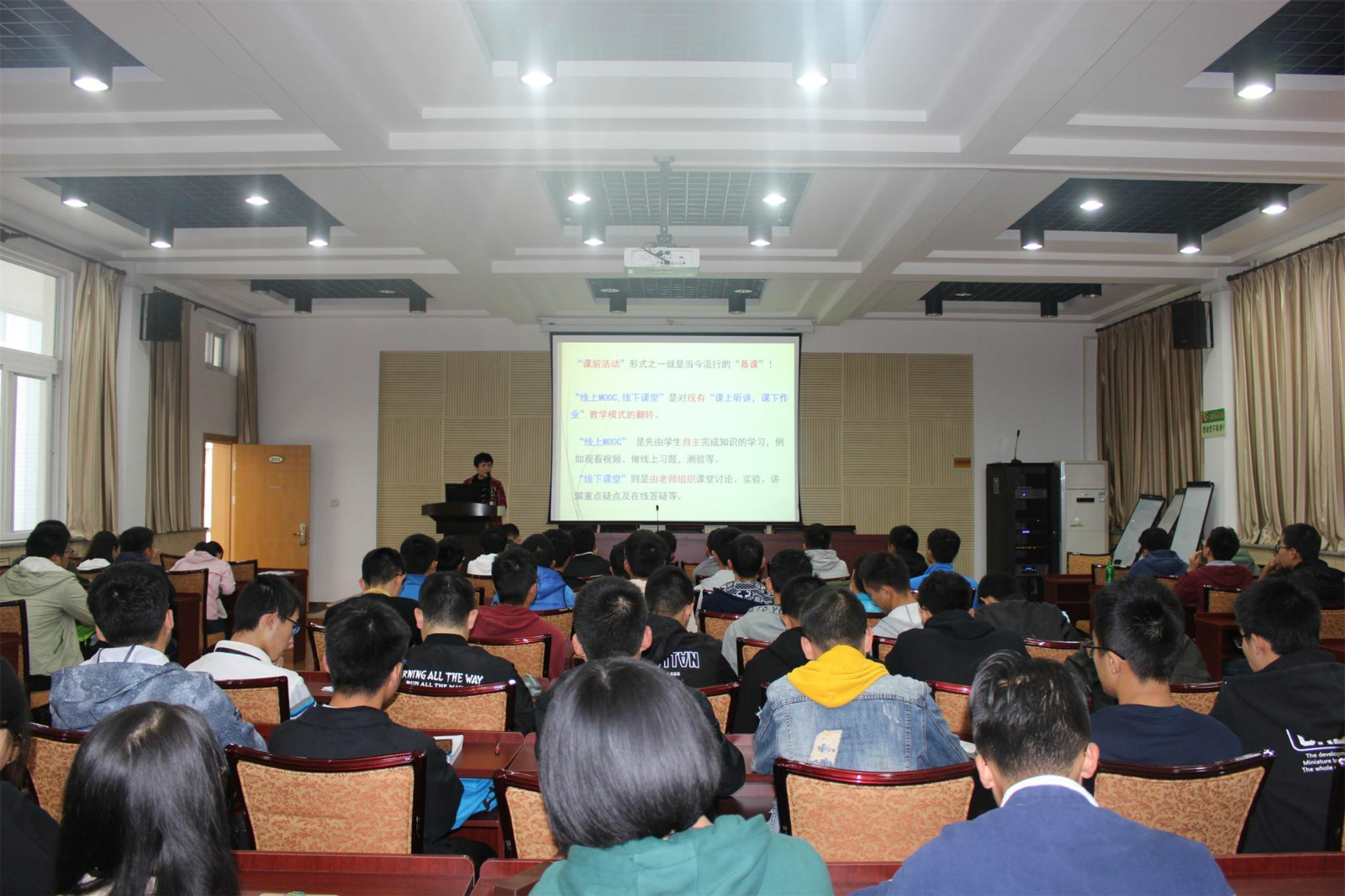 主讲人任国霞副教授介绍了“慕课”这一课外学习的主要形式,列举了Coursera等国内外知名在线学习网站。随后,任老师以自己在中国大学MOOC平台上学习的五门课程为例,详细讲述了慕课的学习方式、课程特点、特色功能等。她讲到:“慕课是一种轻量级的学习方式,不是在增加额外负担。我坚持了几个月后,发现自己爱学习了,每天都期待着发布新的课程。”任老师还了近日在中国大学MOOC平台上线的公司姜在民老师程“植物学”课程片花、网红老师嵩天主讲的《Python》课程片段等,激发了同学们的学习兴趣和热情。