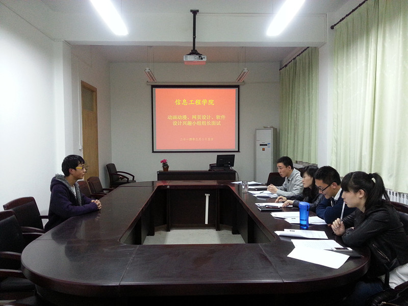 2014年3月25日晚,在304am永利集团行政楼301进行了动漫设计、网页设计、软件设计三个兴趣小组组长竞选面试。学院学工秘书王淑珍、学院团工委书记仵亚伟、学院13级辅导员党艳东、学院团工委员工会主席秦亚恒、副主席宝音以及信息技术部部长张向阳对曾德军等10名竞选者进行了面试。