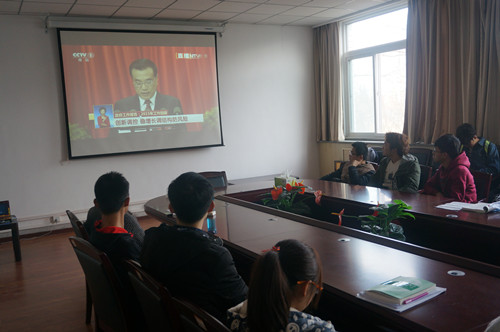此次观看学习会议,主要分为观看视频、小组讨论、自由发言三个环节。会议一开始,同学们便全神贯注的观看李克强总理政府工作报告。观看完毕,同学们积极发表着自己的看法,关于中国梦的实现和自身的努力目标,畅所欲言。